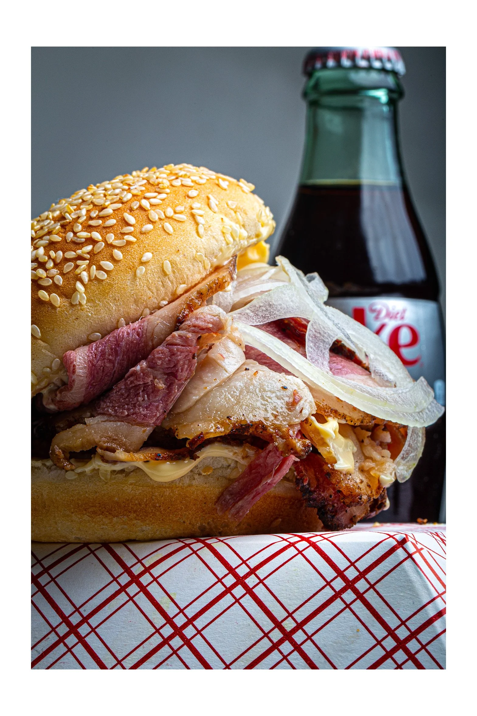 Brisket, horseradish, sliced onions, on a Martin’s bun.