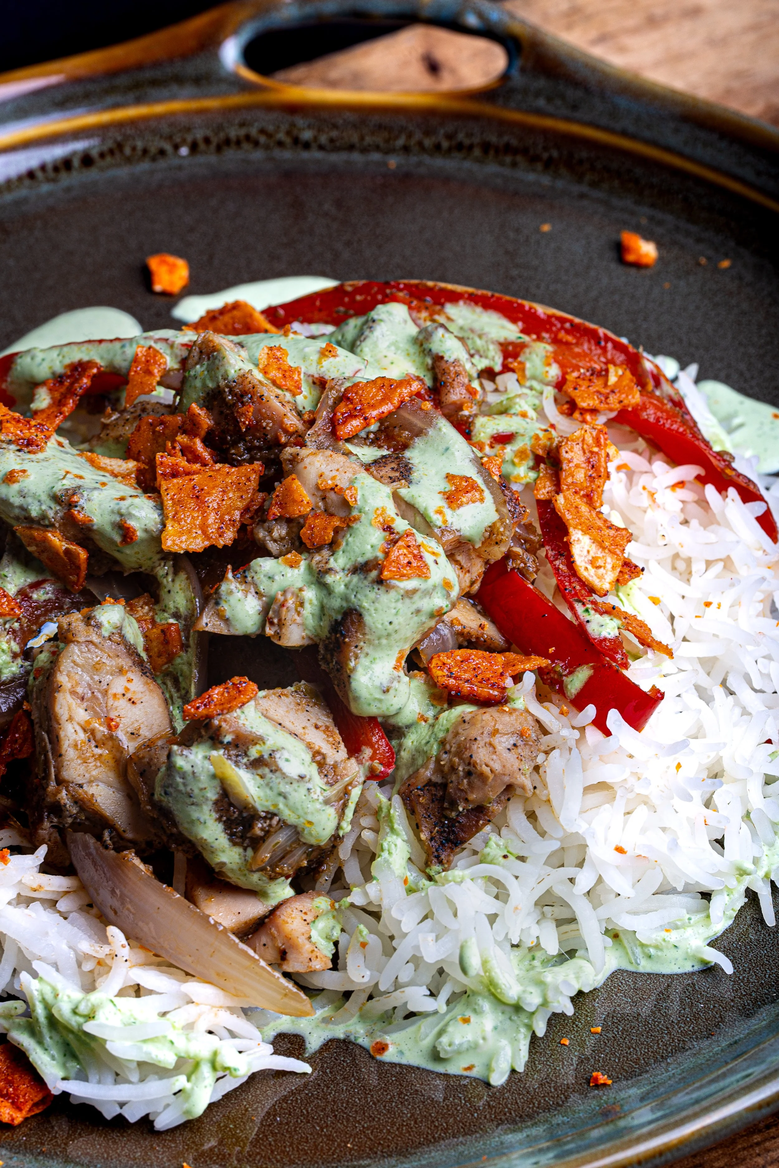 Marinated chicken thighs, basmati rice, bell peppers, onions, chile lime tortilla chips, and a cilantro lime crema
